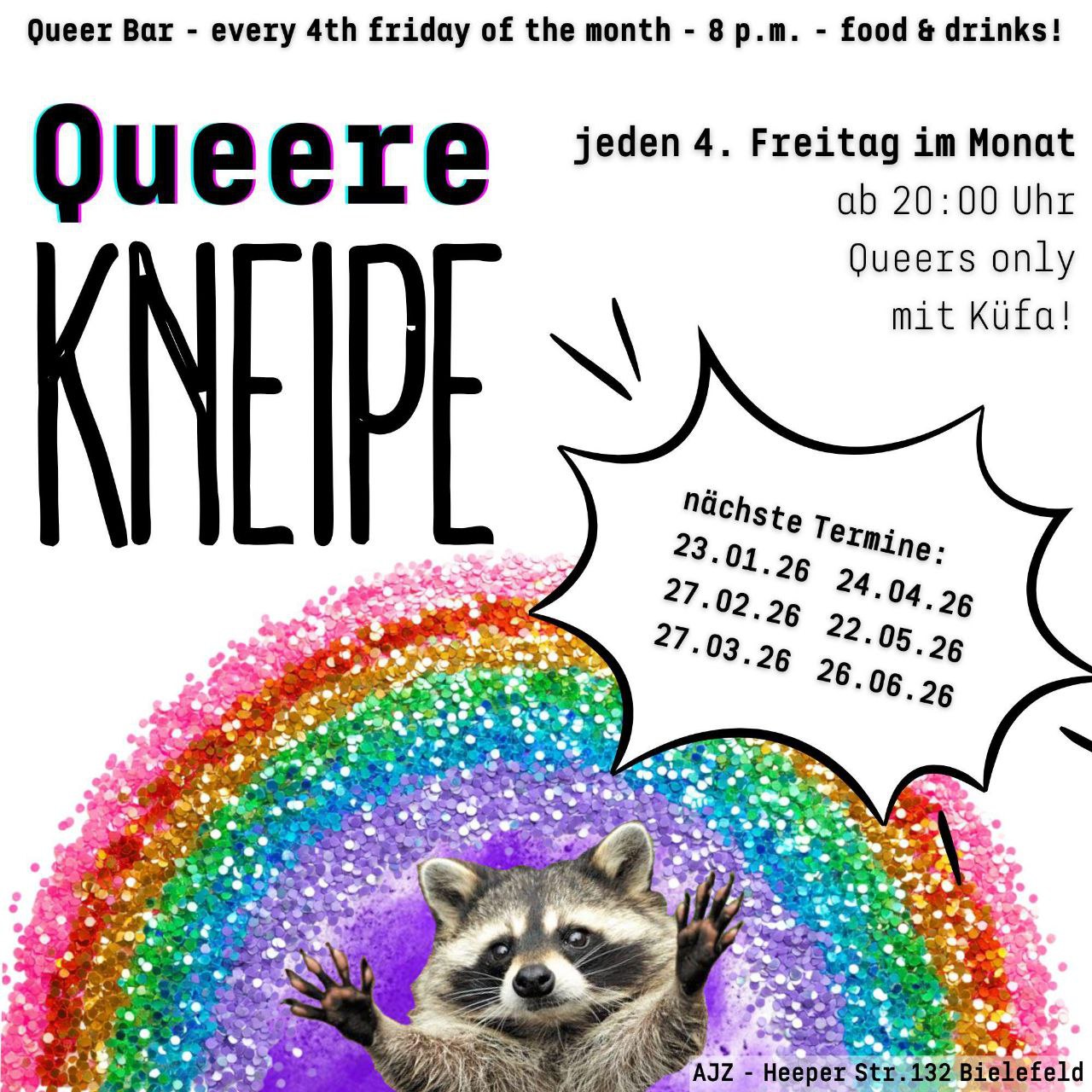 Diesen Freitag, am 27.03, findet die nächste Queere Kneipe um 20.00 Uhr im AJZ statt. Es gibt warmes, veganes Essen gegen Spende und natürlich Getränke mit und ohne Alkohol. Davor gibts queeres Kino ab 18.30 Uhr im AJZ. Sagt euren queeren friends Bescheid und kommt vorbei, wir freuen uns auf euch! This Friday, March 27, […]